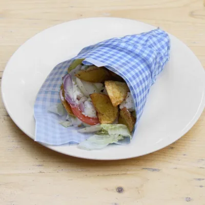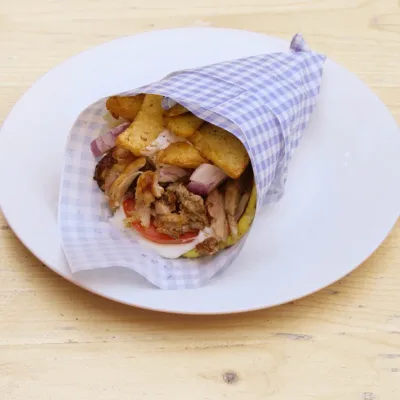 2бр. Гръцка питка, зеленчуци, сос, гирос месо пилешко, пържени картофки....