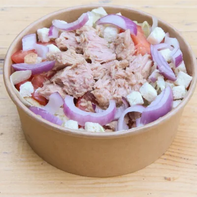 Айсберг, домат, червен лук, риба тон, лимон, зехтин, сол. Общ...